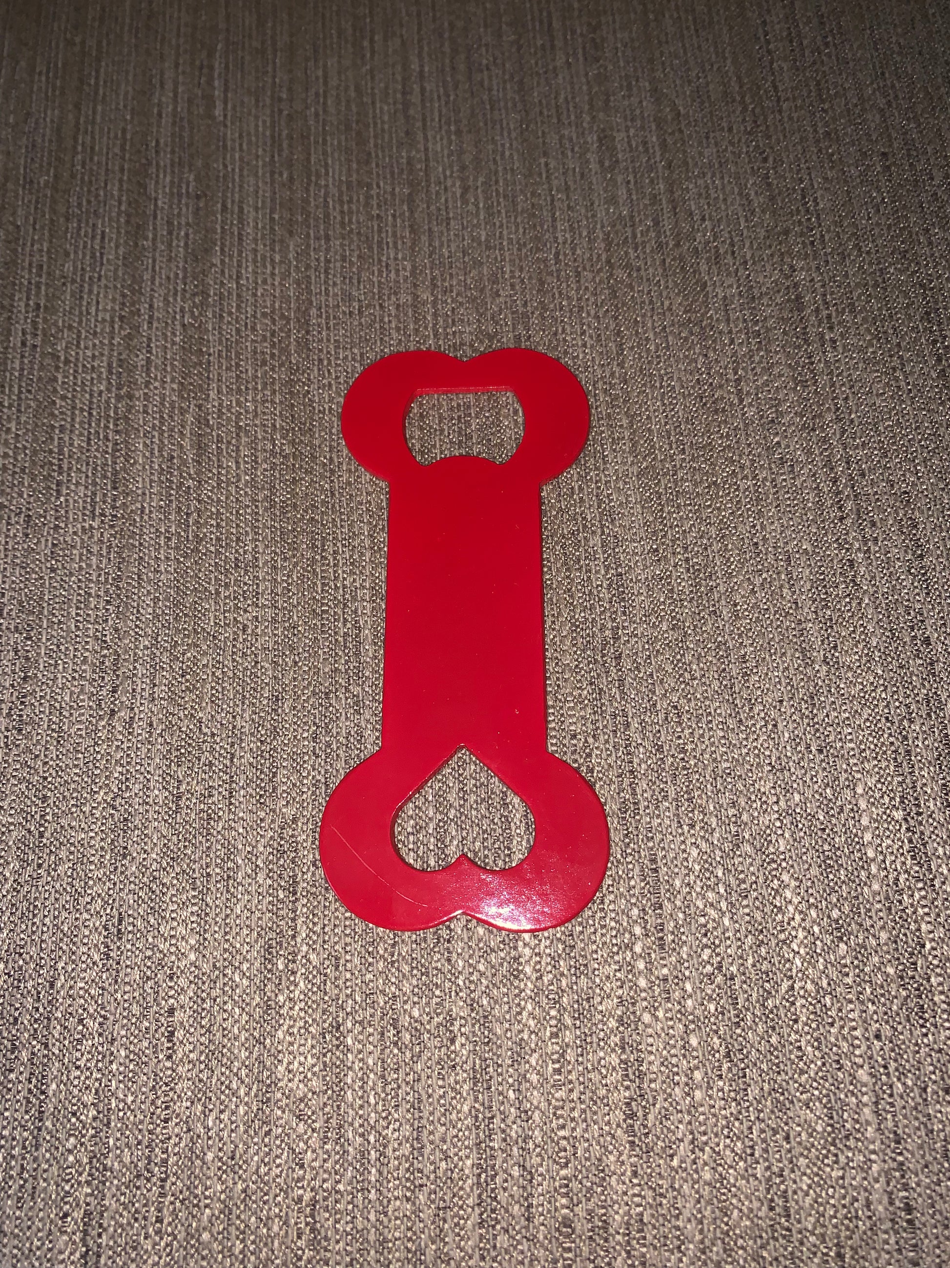 This is a metal cnc cut dog bone bottle opener with a heart cut in one end