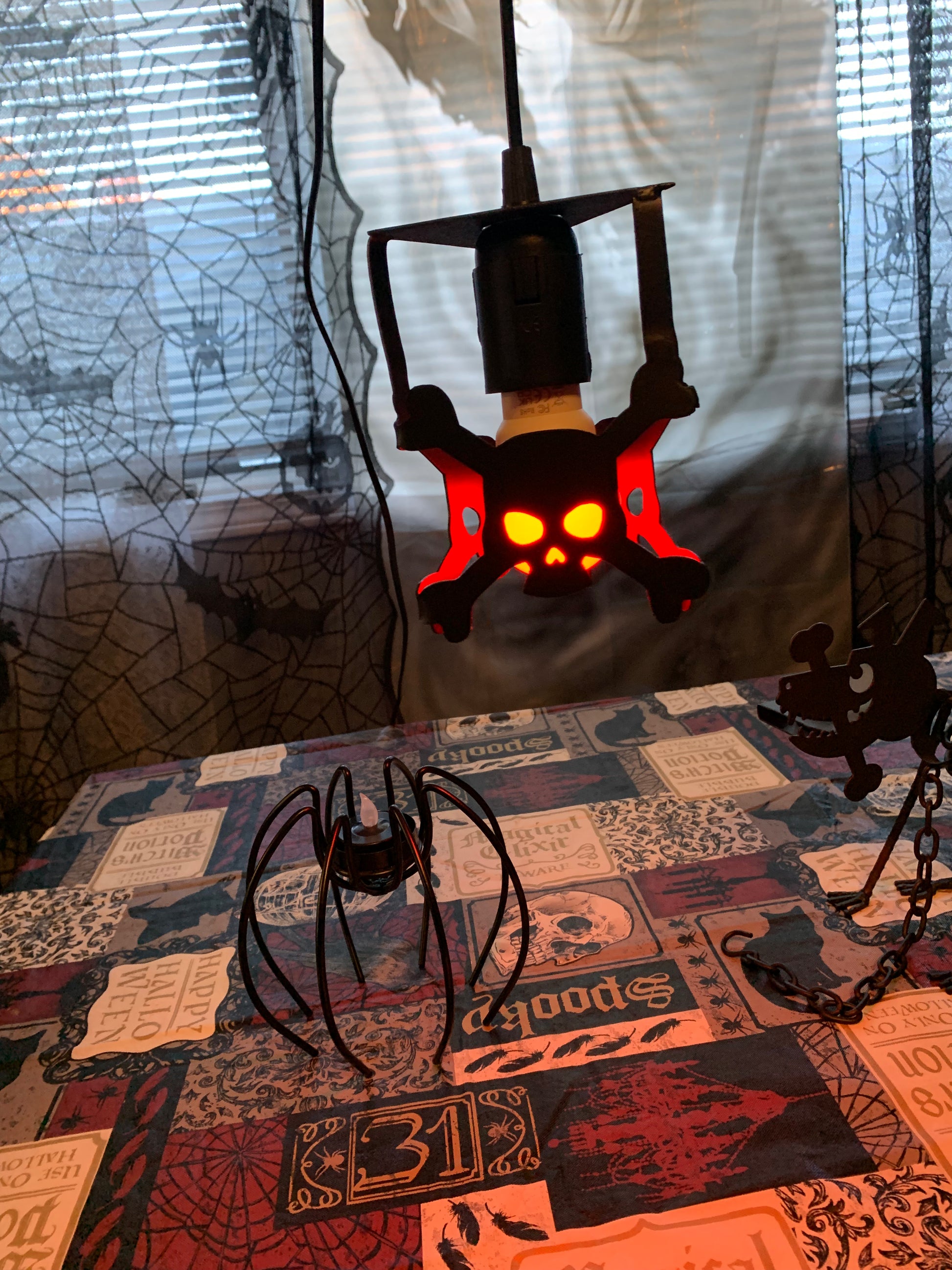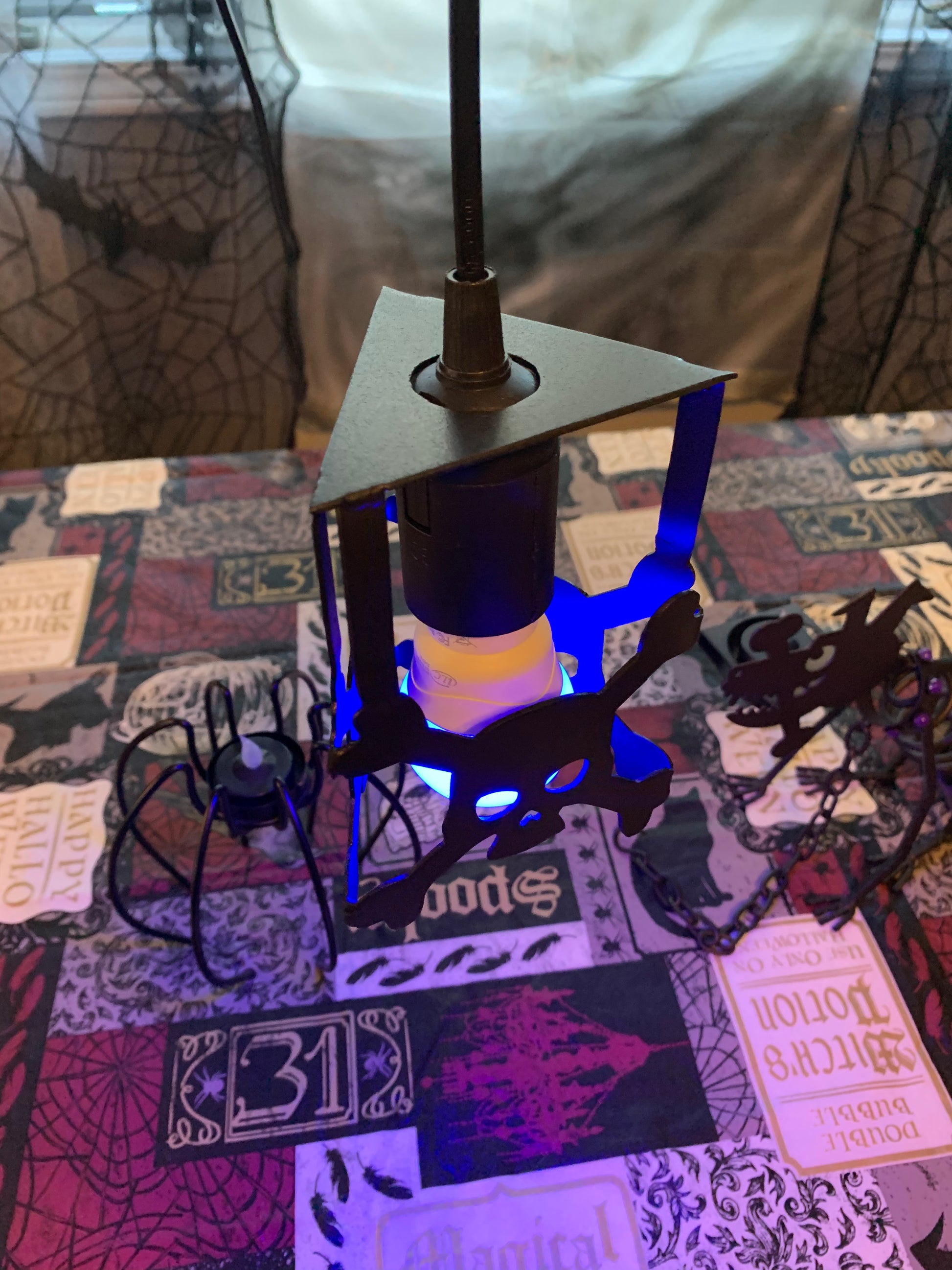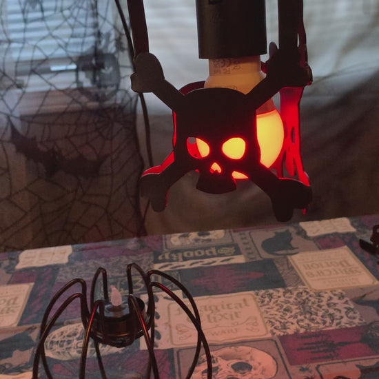 This Hanging Metal Skull Light is the perfect way to add a unique touch to any interior. Its 4in by 5.5in metal construction make it easy to hang from a hook or wall mount. The included color-changing light bulb and remote lets you create the perfect atmosphere for Halloween-themed decorations or a special spooky decor in any room.