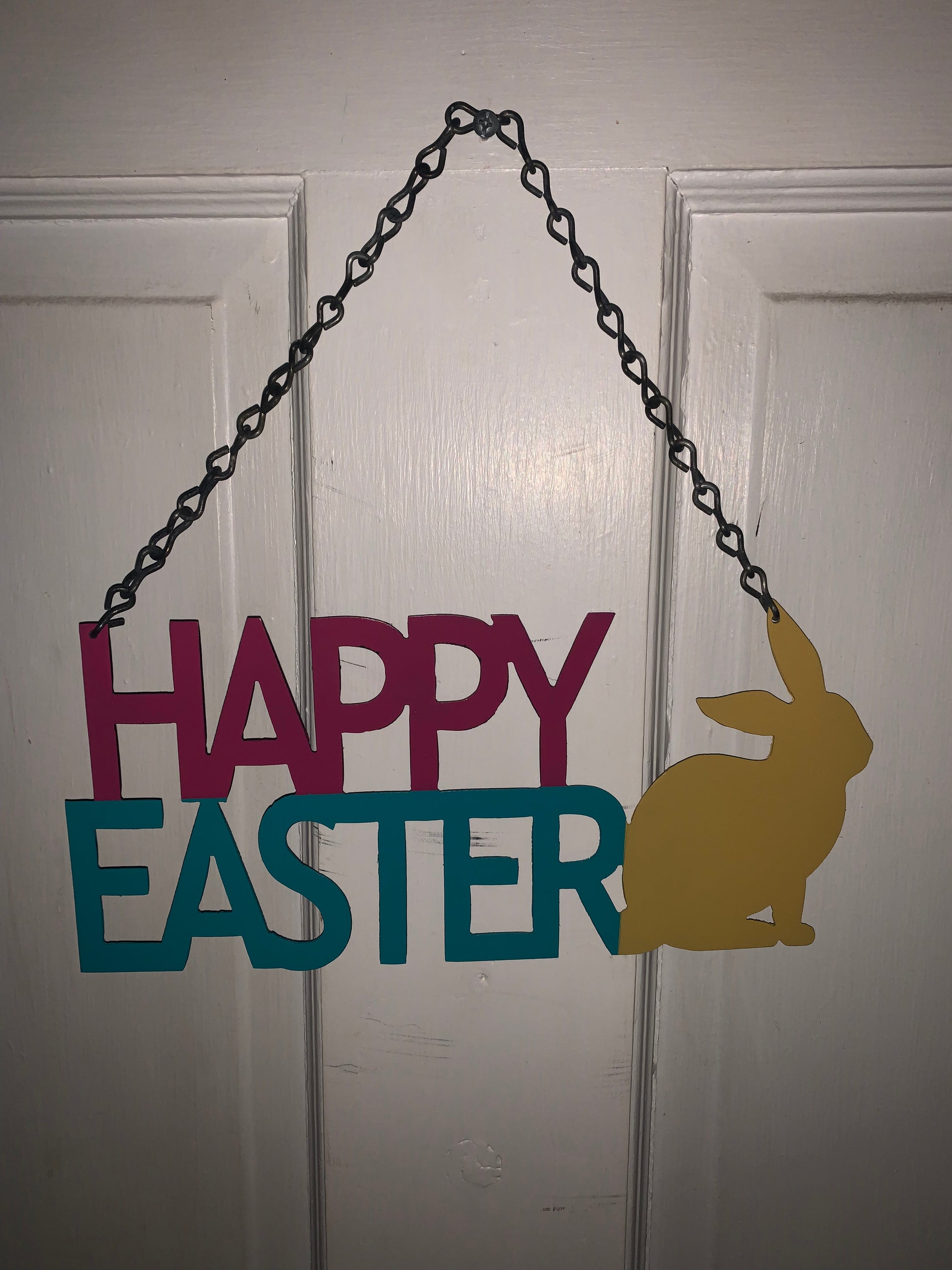 This is a metal cnc cut happy Easter sign painted pink blue and yellow