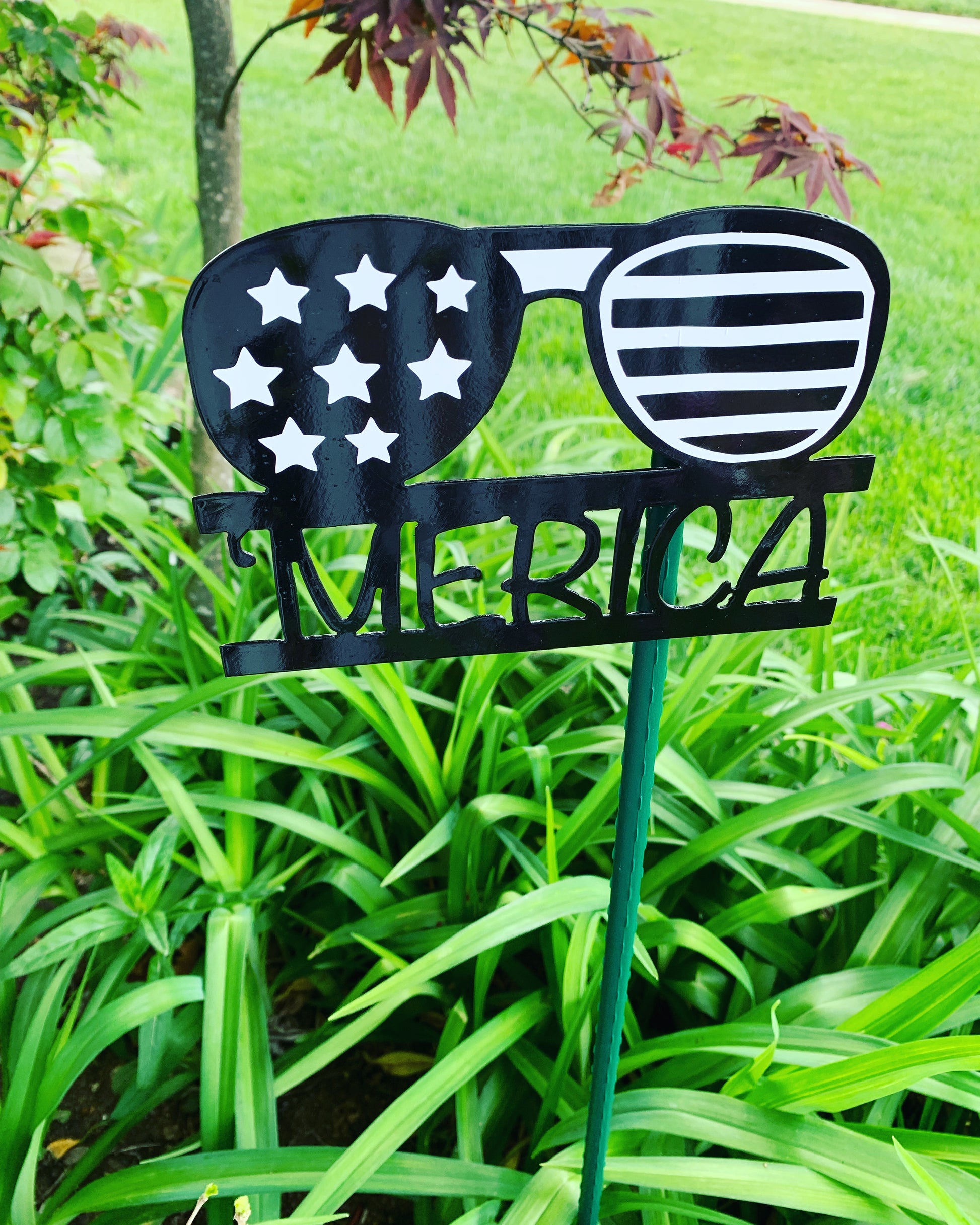 Show your patriotism with this "Merica" garden stake. Made of metal and crafted with CNC cutting, it's the perfect way to proudly display your American pride. The unique design is sure to stand out in any garden or outdoor display.