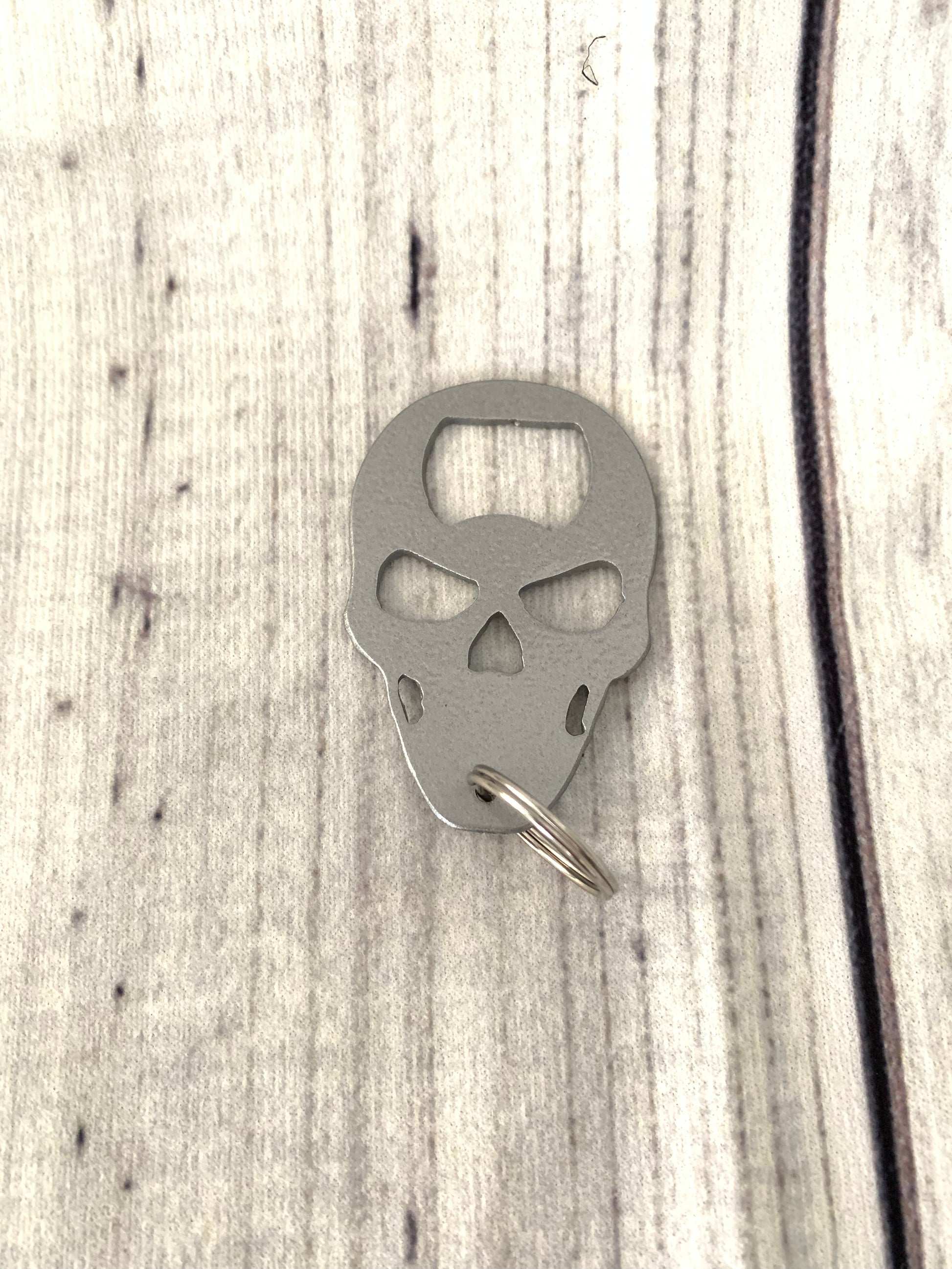 This is a metal cnc cut skull keychain bottle opener. Made from 14ga steal